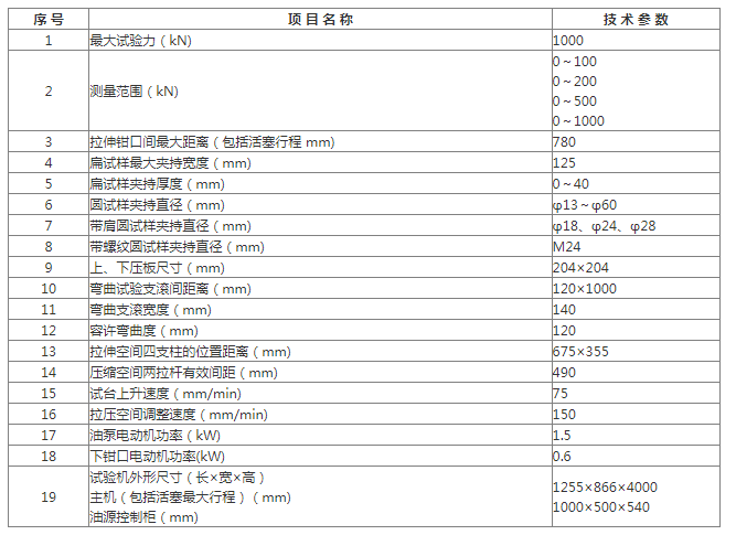 ●WE-1000A型液壓式萬能試驗機主要技術規格及參數: