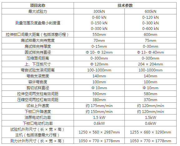 ●WE-300/600型液壓式萬(wàn)能試驗(yàn)機(jī)主要技術(shù)規(guī)格及參數(shù):