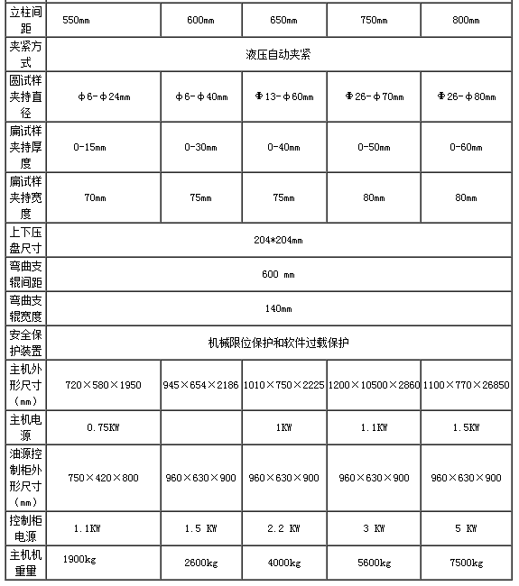 本機由四立柱雙絲杠油缸下置式高強度主機及琴式油源控制柜組成,油泵采用意大利馬祖奇進口低噪音高性能齒輪泵。拉伸空間位于主機上方,壓縮、彎曲試驗位于主機下方即中橫梁和工作臺之間。試驗空間的調整通過移動中橫梁來實現,中橫梁升降采用鏈條傳動。手動調整送油閥進油量來實現材料的拉伸、壓縮、彎曲等試驗。試驗結束后自動采取材料的FM、REH、REL、RPO.2、RP1、RM和彈性模量E等實驗結果。